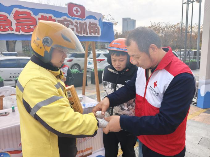现场设置的“急救动作快闪挑战”也吸引了不少骑手参与打卡,他们只要在1分钟内完成基础止血包扎或心肺复苏模拟动作即可获得印章,兑换保温杯、定制冲锋衣等暖心好礼。趣味十足的活动形式,既调动了骑手们的参与热情,也更有助于骑手们在轻松愉快的氛围中掌握急救本领。