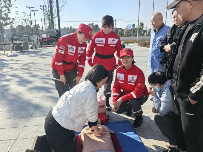 本次活动聚焦“健康中国,急救护航”的理念,现场设置了急救装备与技能联合展示区和智慧急救场景模拟区两大核心板块。在装备展示区,救援队队员与医院医护人员共同展出了心肺复苏设备、AED、基础急救包等常用急救物资,还带来了救援队的专业应急救援装备,从无人机到水上救援设备,让市民直观感受应急救援的“硬核实力”。队员们现场演示了心肺复苏、伤口包扎等基础急救技能,并邀请市民上手实操,一对一纠正动作,确保大家听得懂、学得会、用得上。