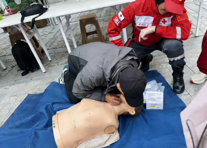 在志愿服务市集的救护科普展位,救援队的志愿者们通过模拟人演示,向市民直观讲解了心肺复苏(CPR)的完整流程。从判断意识、胸外按压到开放气道、人工呼吸,每一个步骤都被细致拆解。